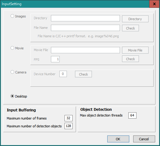 Input Settingボタンをクリックすると、画像入力の設定画面が表示されます。 この画面の設定で、入力画像に関する加工などの設定のパラメータの変更が可能です。 |