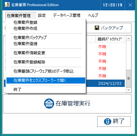 | ②メニューの「在庫案件管理 ― 在庫案件をエクスプローラーで開く」を選択 |